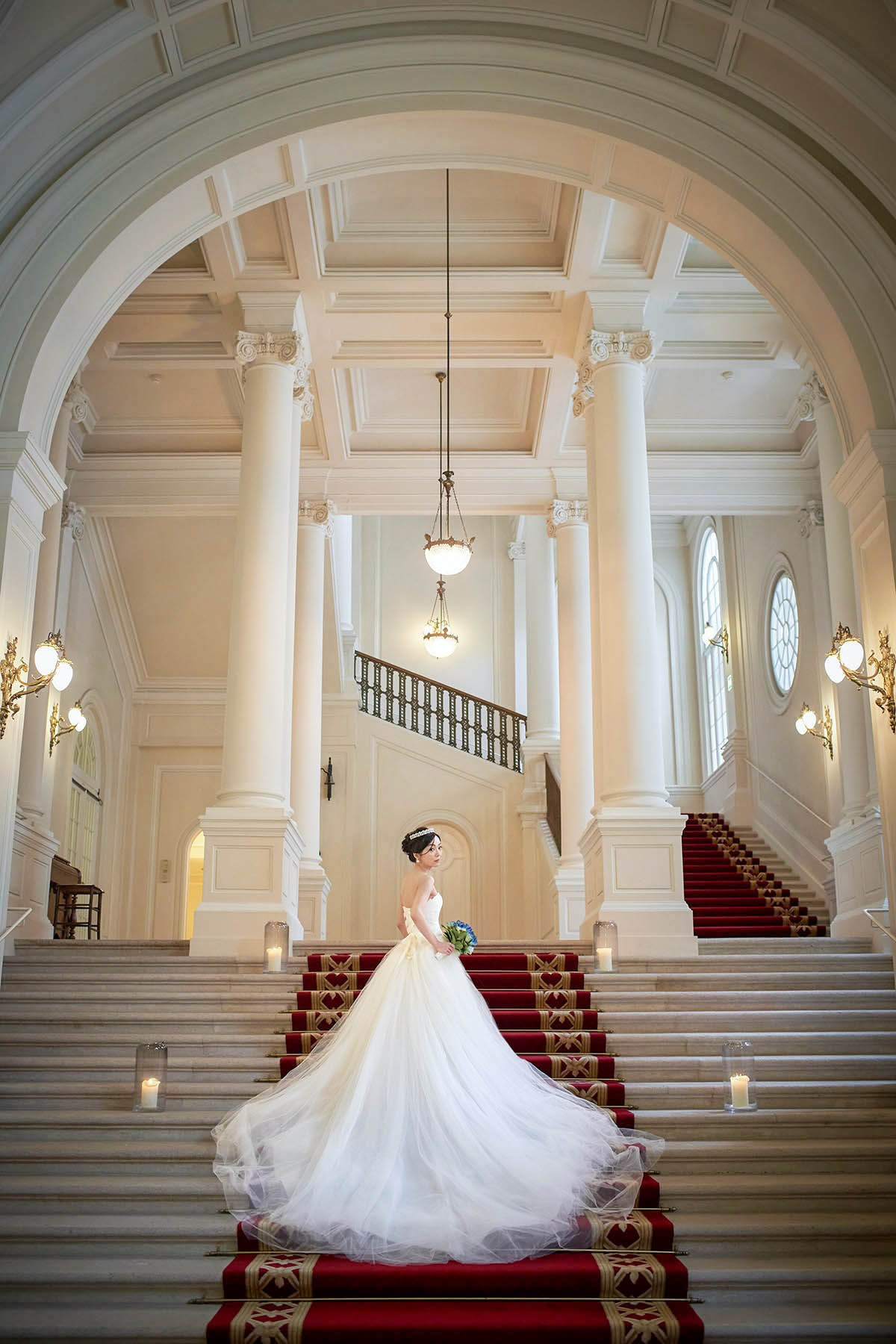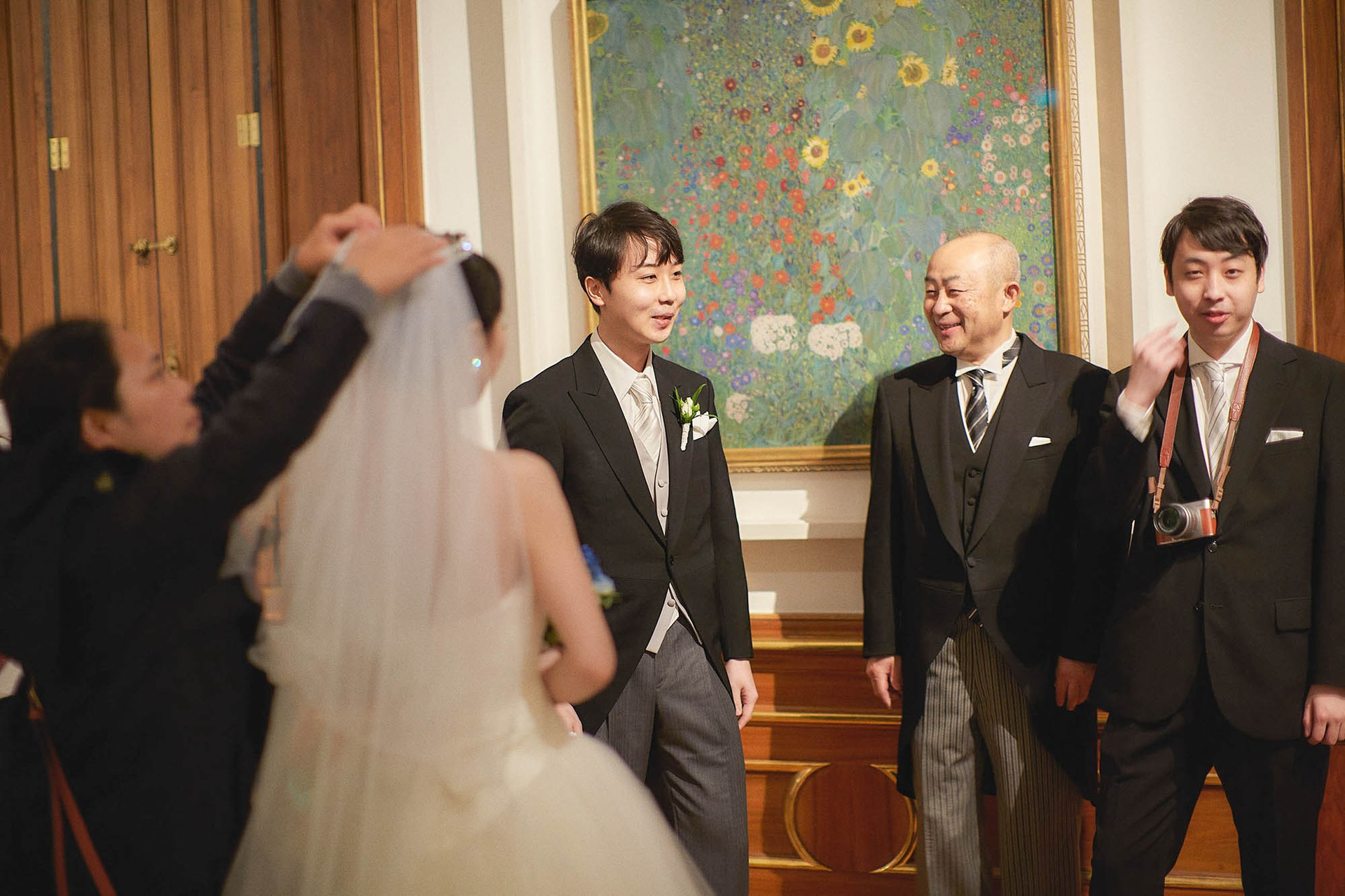 In the ceremonial hall beneath gold-adorned ceilings once reserved for emperors, family and friends from Japan watched breathlessly as Hitomi and Katsuya exchanged vows, a rainbow unexpectedly arching beyond the grand windows over the Lower Belvedere garden. Braving the plunging temperatures and soft snow, they stepped into the imperial gardens for fleeting portraits—Katsuya sweeping his bride into his arms amid swirling veils and vivid sun flares, the Baroque façade framing them like a masterpiece, another rainbow sealing the moment.