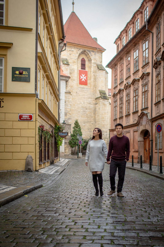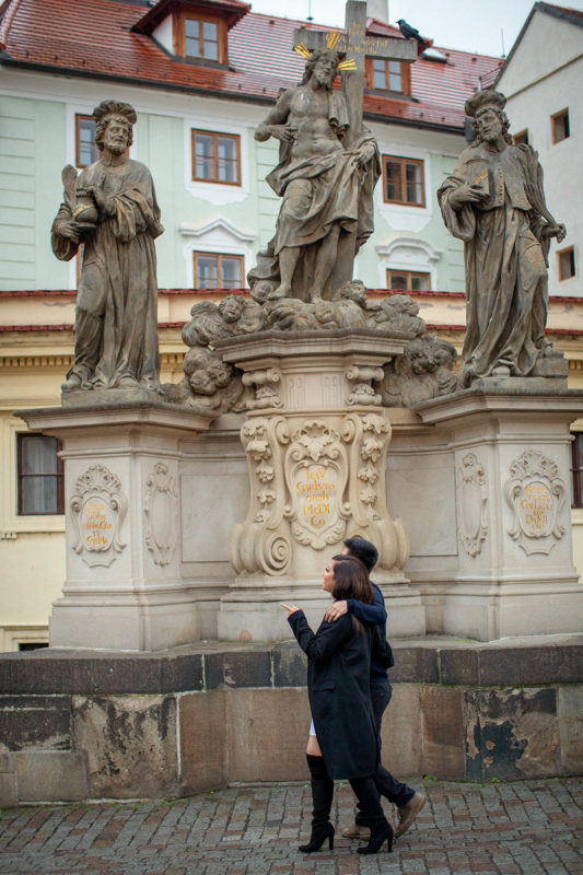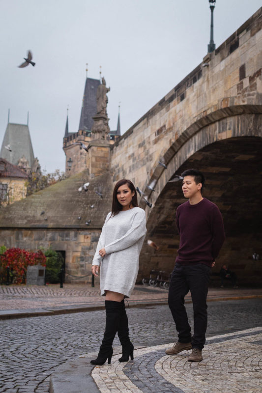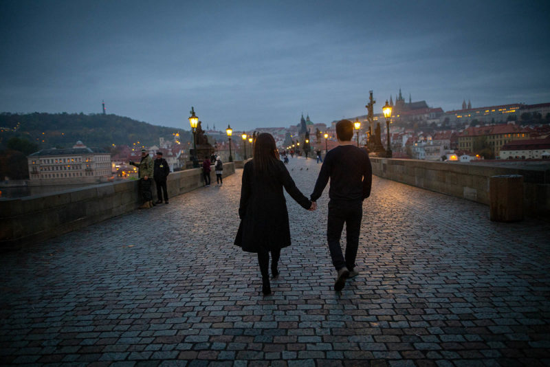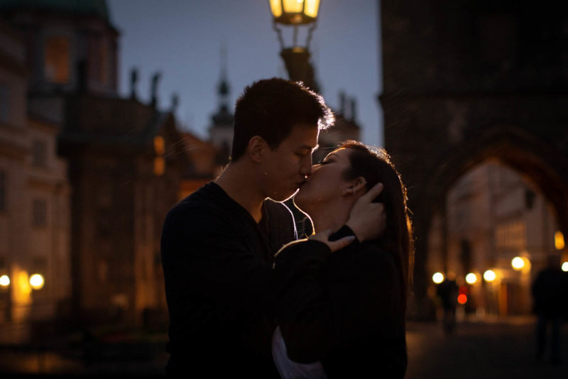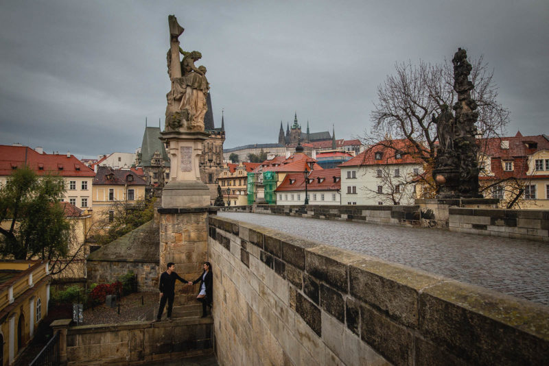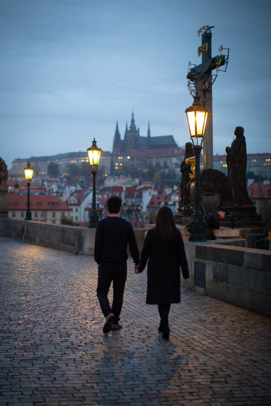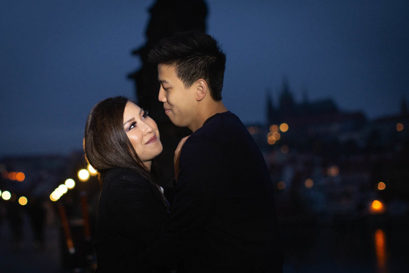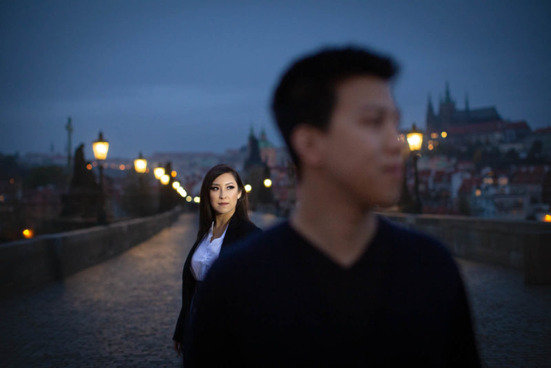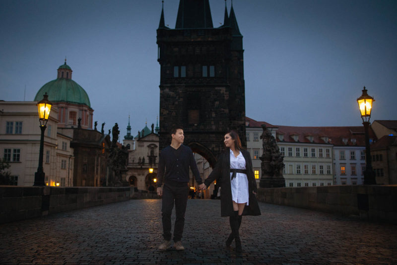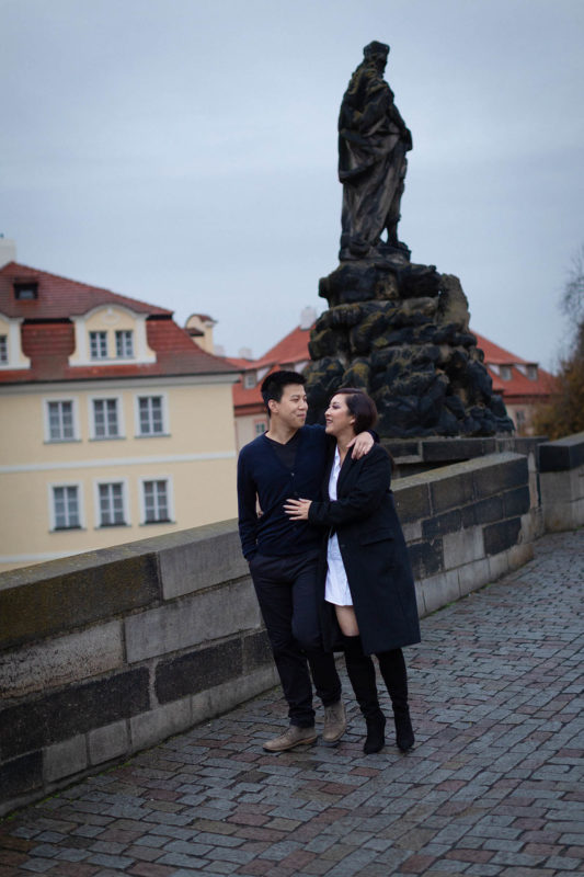 Amanda & Derrick from sunny California admires this look and wanted much the same but also a sense of location and a more ‘Gothic’ and ‘dark & moody’ feel to their images. As nearly every session is uniquely tailored to my clients wishes, we did exactly that. We started their session on the Charles Bridge before dawn, using minimal artificial light to go with their desire of having a more dark & moody look to their images. Prague’s gothic atmosphere naturally suited their style and what unfolded was a bespoke engagement session befitting these two silican valley people who wanted something far more than the norm here in Praha.