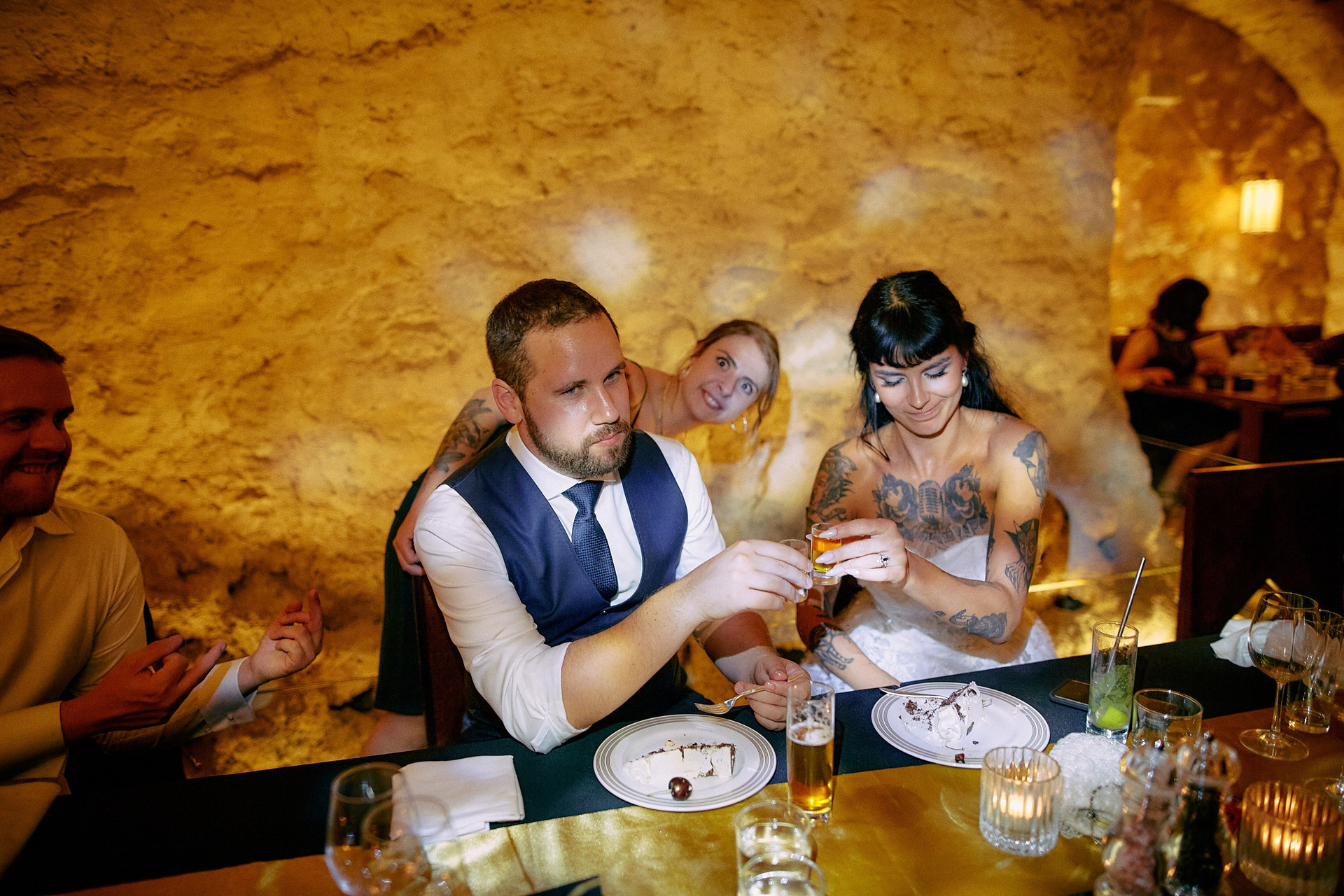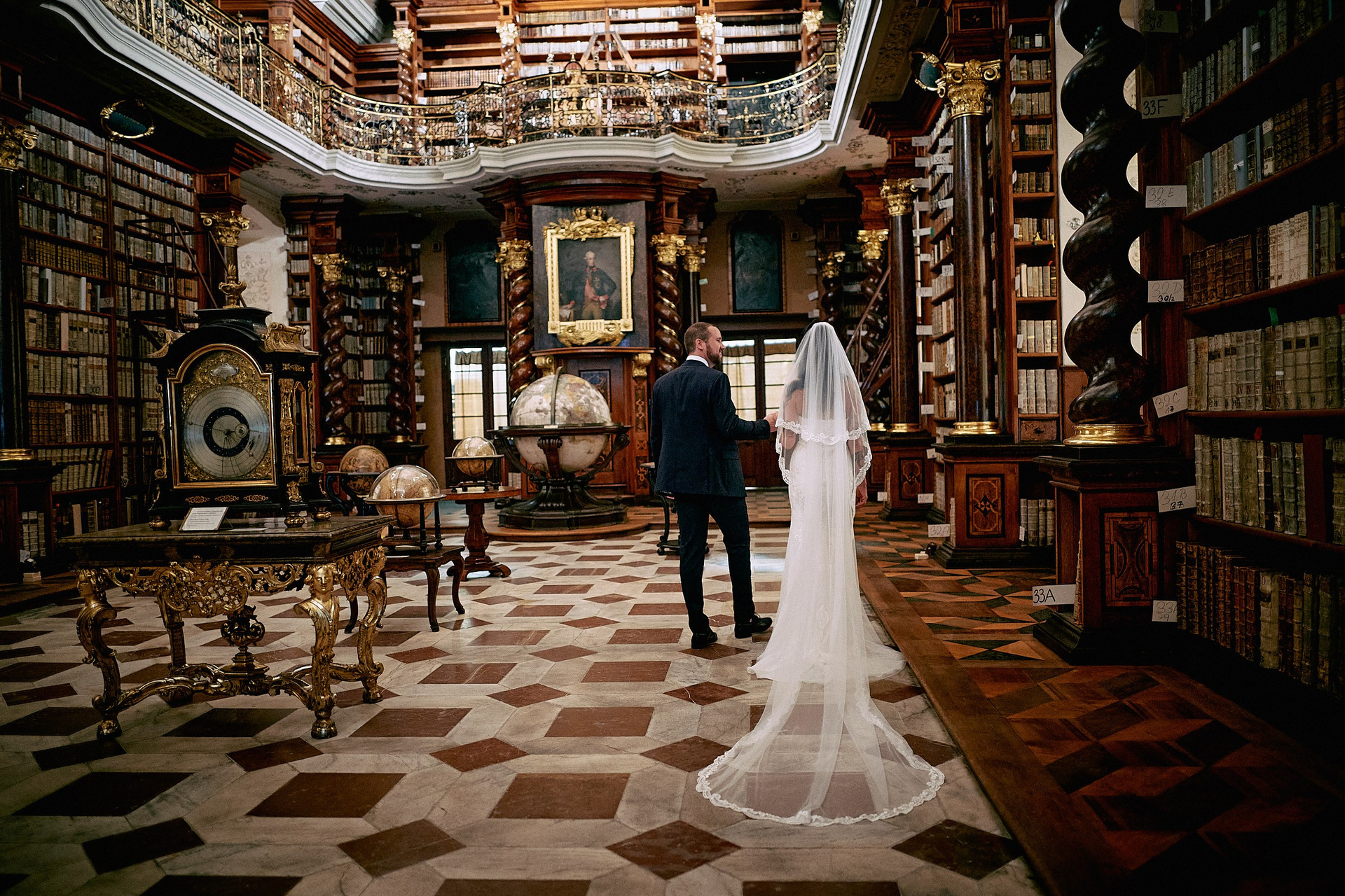 After the ceremony? An exclusive photoshoot in the breathtaking Klementinum Baroque Library — 18th-century shelves, ancient globes, and a dusty light filtering through the glass. Courtney in white lace. Dean in style. History as their witness.
