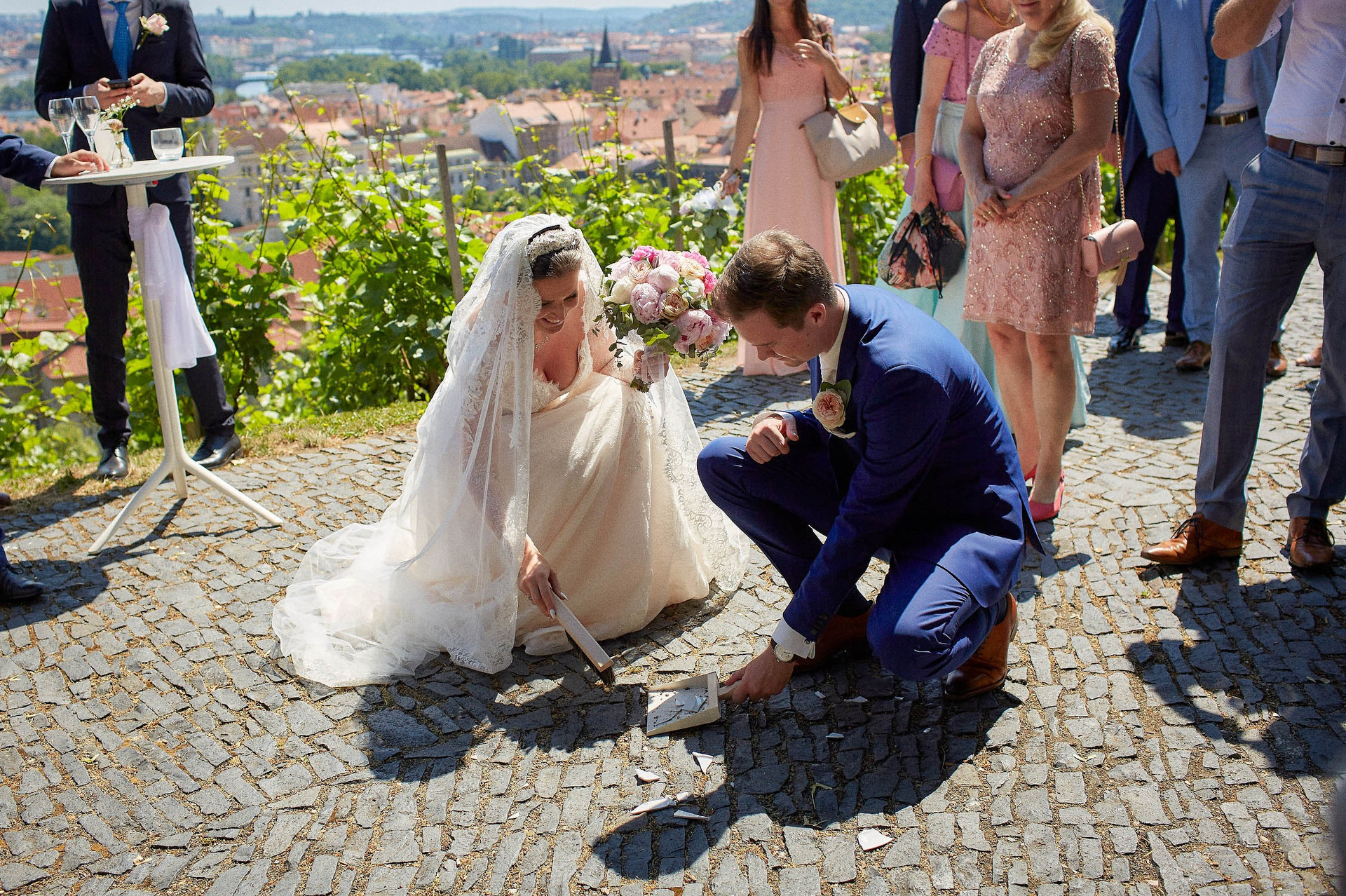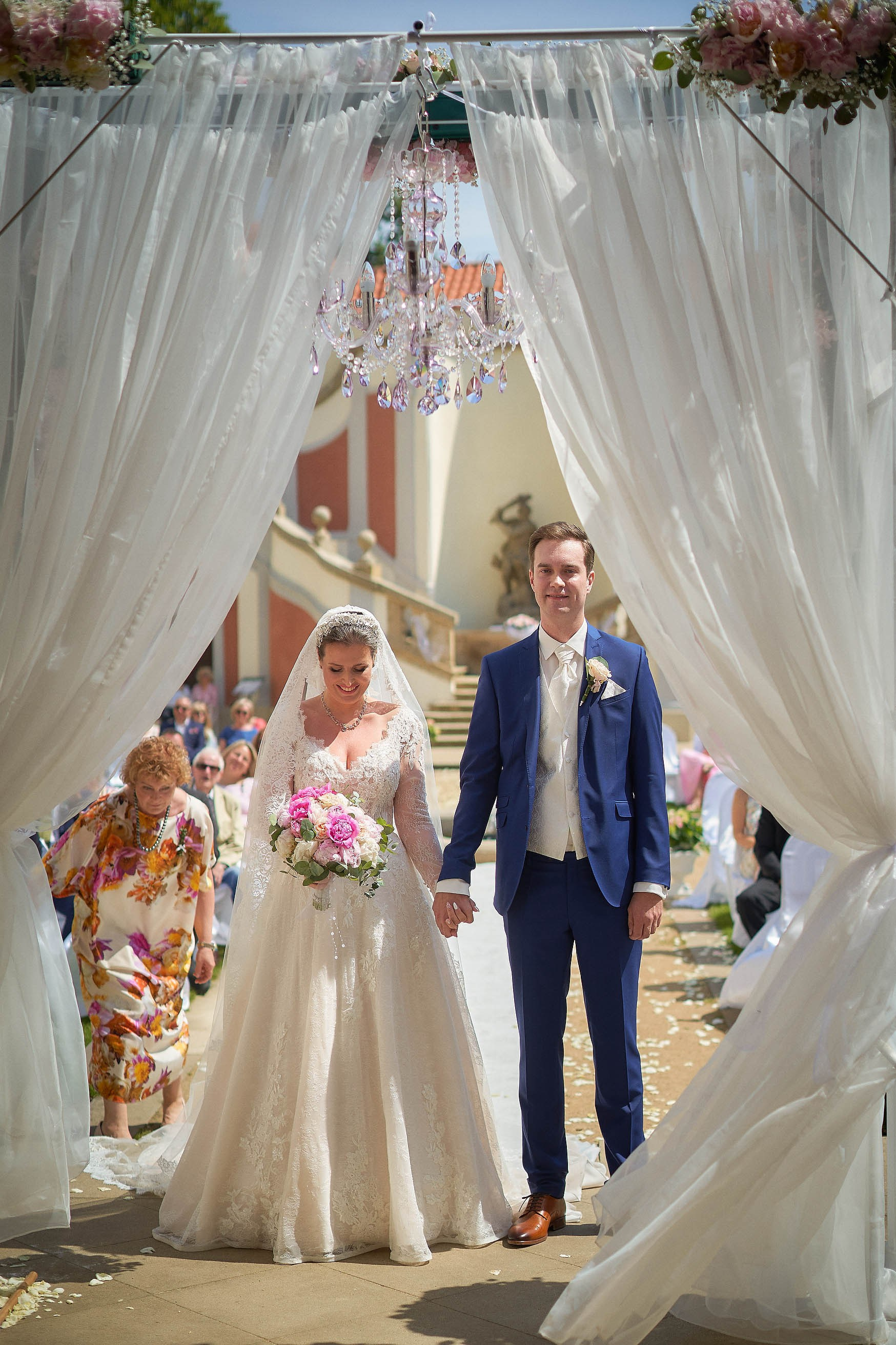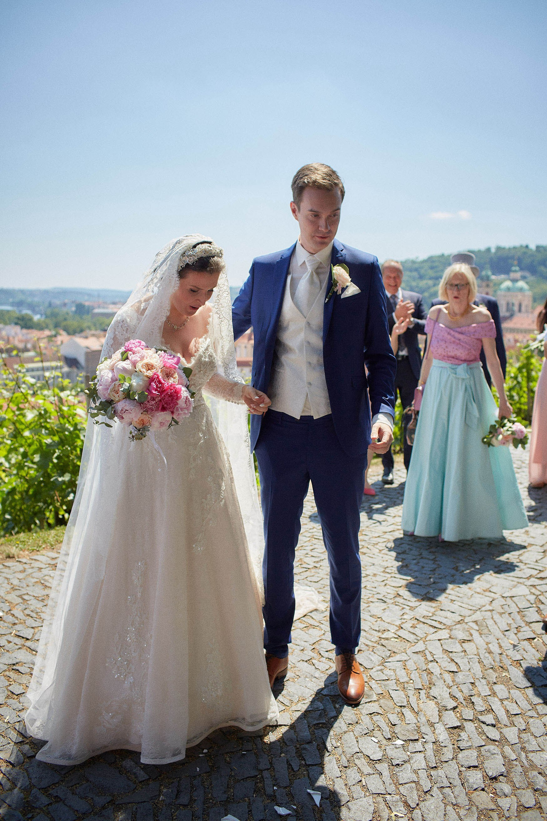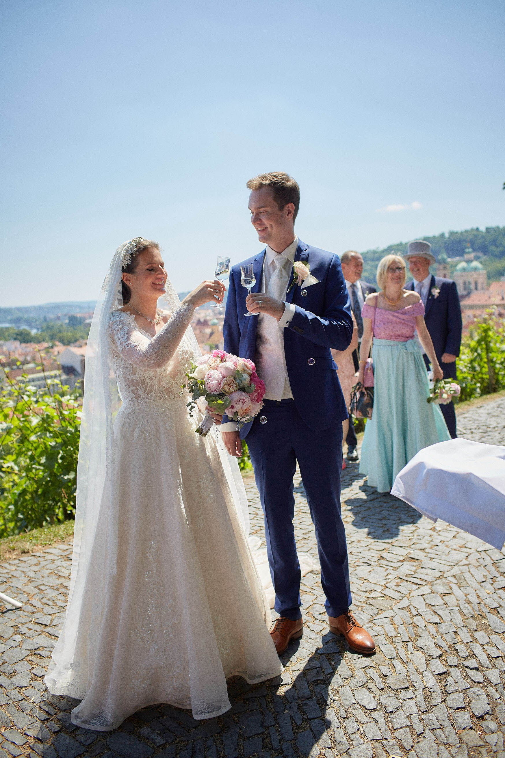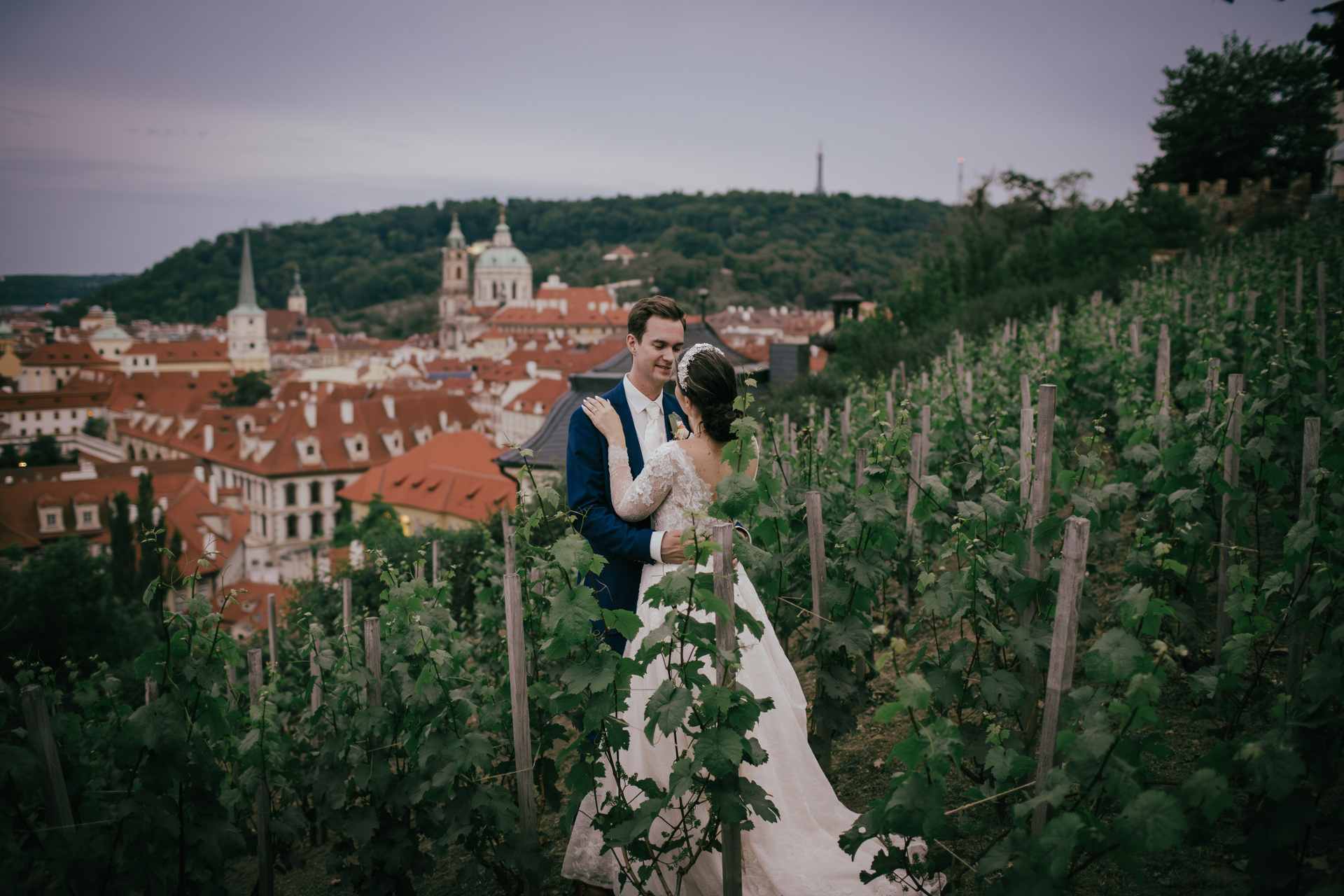As the celebration moved to the charming Villa Richter, nestled among vineyards with panoramic views over the city, joy filled the air with laughter and toasts. Later, slipping away from their guests, Adéla and Matthias stole intimate moments gazing at the sparkling lights below—a picture-perfect close to their day.