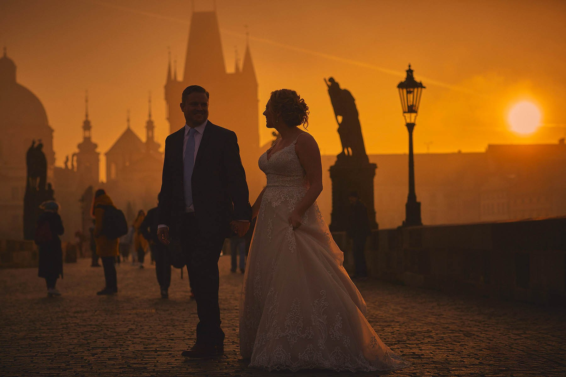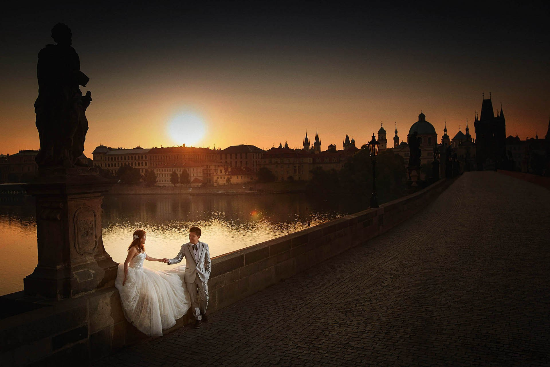 A couple watches the golden sunrise flare above Charles Bridge riverside