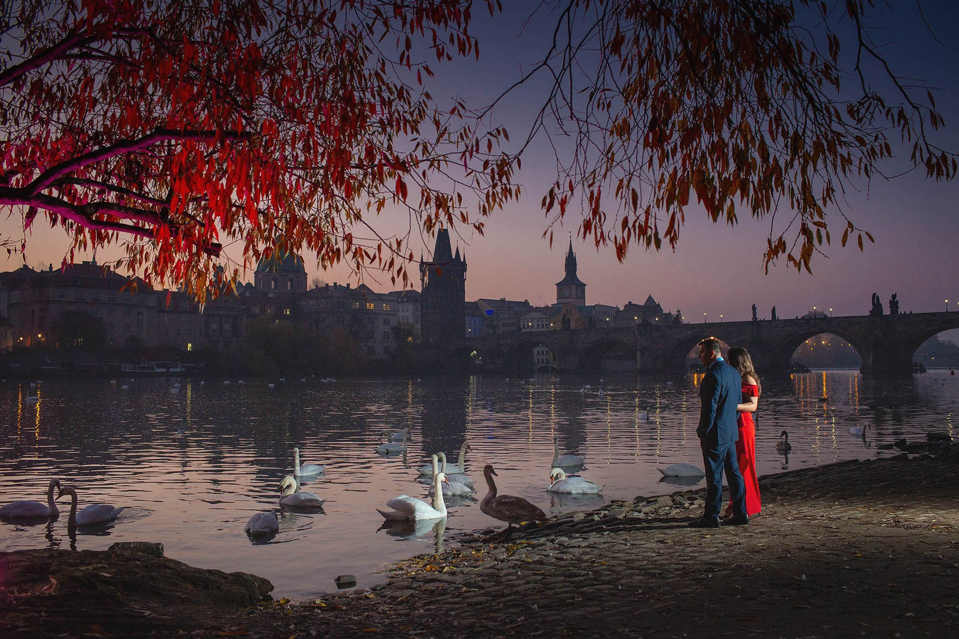An American couple watches swans glide along the Vltava at Charles Bridge at dawn