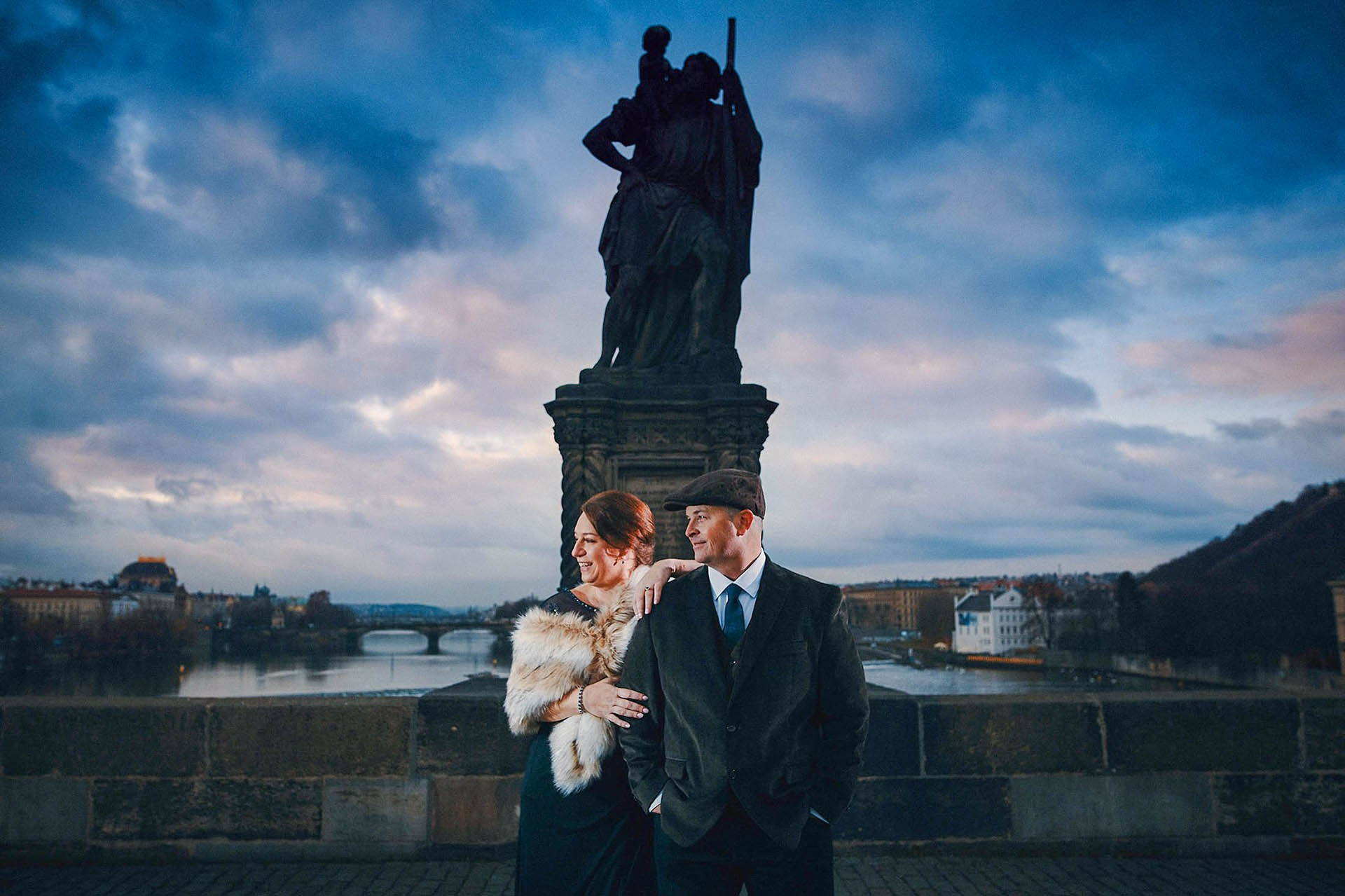 Vintage-dressed Julie and Donny beneath Charles Bridge statues as the sky flares above.