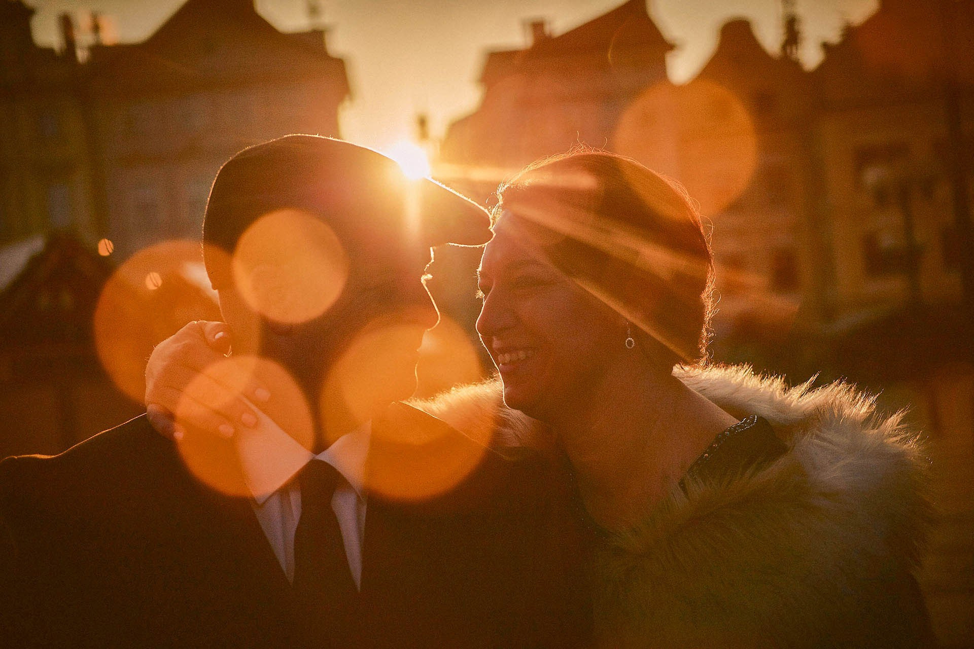 An American couple silhouetted against Tyn Church spires at dawn